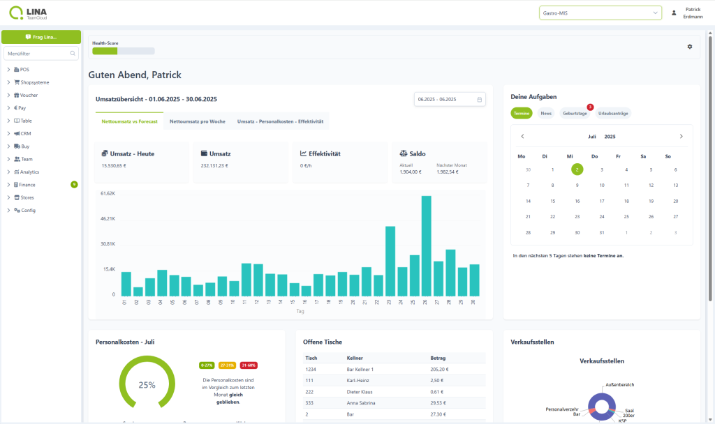 Von der Bestellung (Shop) bis zur Bezahlung (Pay), von der Personalplanung (Team) bis zur Warenwirtschaft – LINA steuert alle Prozesse im Unternehmen. LINA zeichnet sich durch ihren Aufbau aus, der sich flexibel anpasst – von der Küchensteuerung (Kitchen) bis zur komplexen Steuerung von Filialisten (Stores).