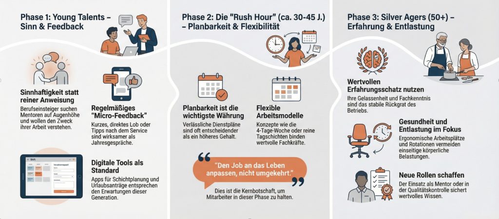 Wer versteht, dass sich Bedürfnisse mit verschiedenen Lebensphasen ändern – von der Ausbildung über die Familiengründung bis zur Pflege von Angehörigen –, kann Arbeitsbedingungen schaffen, die Mitarbeiter langfristig im Gastgewerbe halten, statt sie an „9-to-5-Branchen“ zu verlieren.
